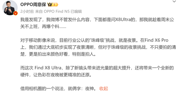 2月23日,OPPOFind系列产品负责人周意保发文,透露了OPPOFindX8Ultra的部分消息,起发文称,最近有不少人都找他询问FindX8Ultra的消息,自己也决定趁着周末爆个料。他表示:“对于移动影像来说,目前行业公认的‘珠峰级’挑战,就是夜景。在FindX6Pro上,我们通过大底初步实现了夜景清晰,但对于珠峰级的夜景挑战,不只要拍的清楚,更是拍出来颜色好看,特别是拍人。而这次FindX8Ultra,除了新镜头带来进光量的超大提升,还将带来一个全新的硬件,让色彩在夜晚被更精准的还原。借用相机圈的一个说法,就俩字:夜神。”